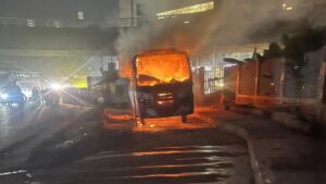 রামপুরায় টিভি ভবনের সামনে বাসে আগুন