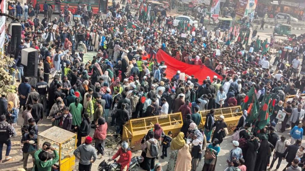 শনিবার (২৭ ডিসেম্বর) দুপুর সাড়ে ১২টার দিকে আজিজ সুপার মার্কেটের সামনে থেকে মিছিল নিয়ে ইনকিলাব মঞ্চের নেতারা শাহবাগ মোড়ে এসে জড়ো হন।