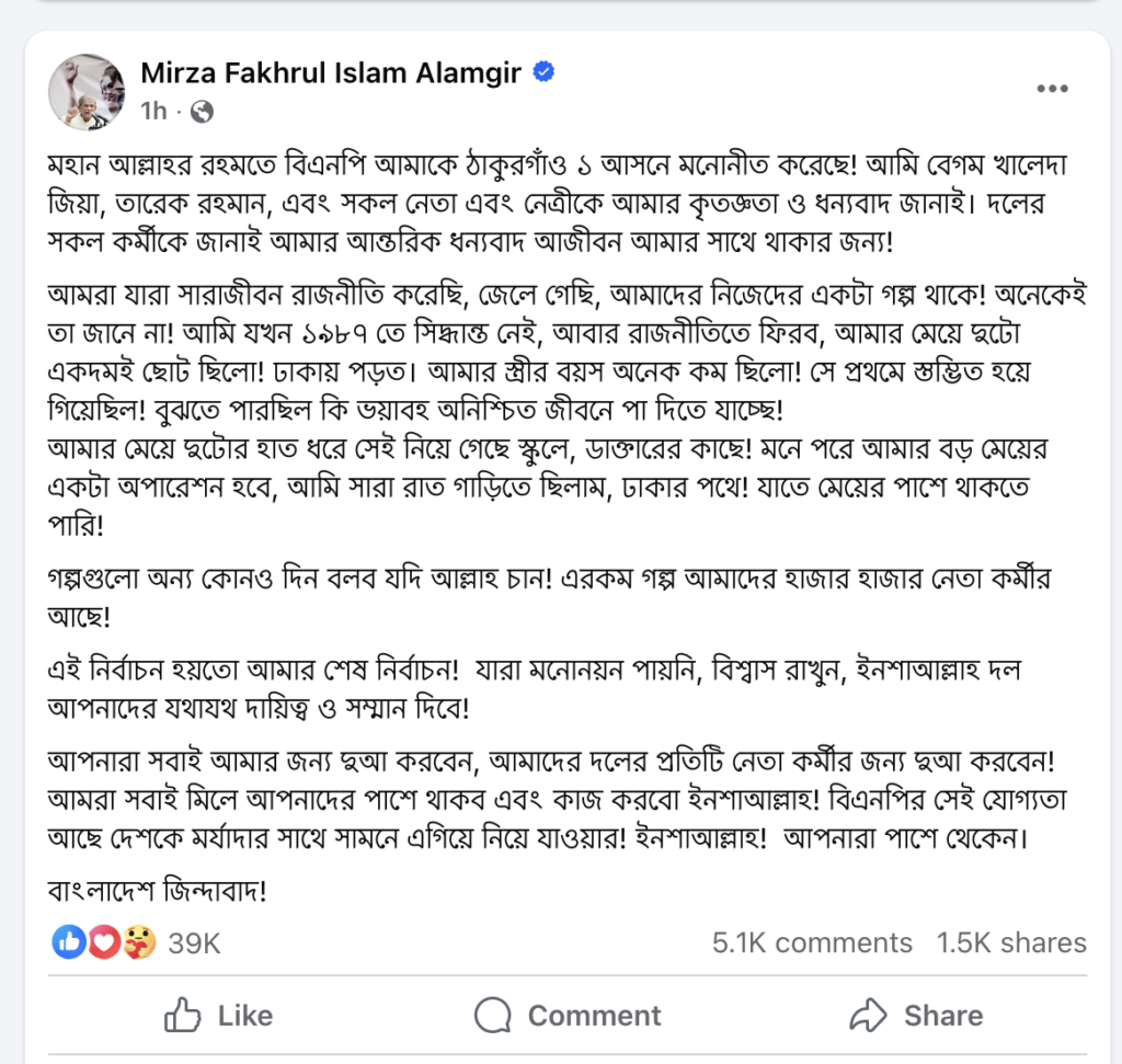 পোস্টে মির্জা ফখরুল লিখেছেন, মহান আল্লাহর রহমতে বিএনপি আমাকে ঠাকুরগাঁও-১ আসনে মনোনীত করেছে। আমি বেগম খালেদা জিয়া, তারেক রহমানসহ দলের সব নেতা-নেত্রীকে আন্তরিক কৃতজ্ঞতা জানাই। একই সঙ্গে দলের সব কর্মীর প্রতিও আজীবনের ভালোবাসা ও ধন্যবাদ জানাই—তারা সারাজীবন আমার পাশে থেকেছেন।