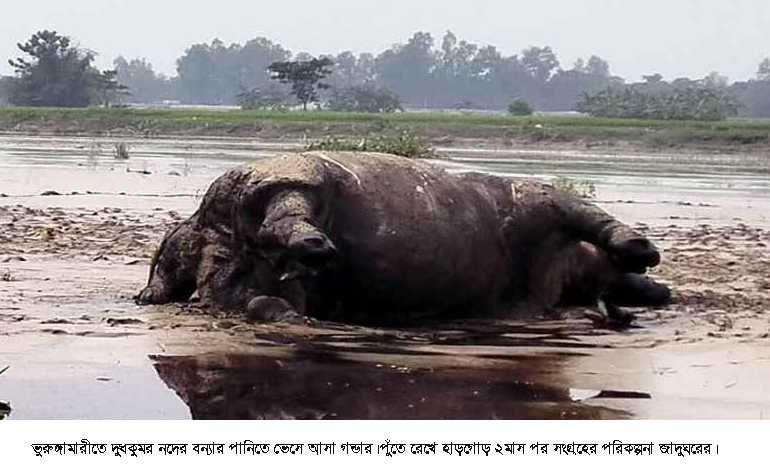 কুড়িগ্রামের ভূরুঙ্গামারীতে দুধকুমর নদের ওপর দিয়ে ভেসে এসেছে একটি মৃত গন্ডার।ওই নদের চরে এটি আটকা পড়ায় তা স্থানীয়দের চোখে দৃশ্যমান হয়। এক মেট্রিক টন ওজনের গন্ডারটি দেখা যাওয়ায় তা দেখতে নদ এলাকায় জনতার ভিড় লক্ষ করা যায়।