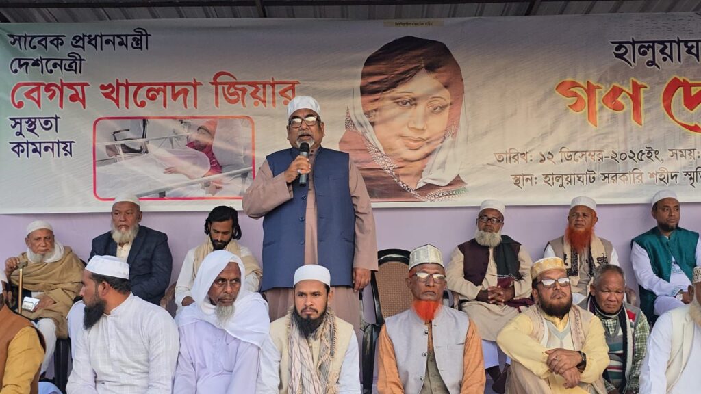 হালুয়াঘাট উপজেলা বিএনপির ব্যতিক্রমধর্মী গণ দোয়া অনুষ্ঠানে বেগম খালেদা জিয়ার সুস্থতা কামনায় আসন্ন নির্বাচনে বিভিন্ন দলের মনোনীত প্রার্থীসহ বিভিন্ন রাজনৈতিক দলের নেতাকর্মী, বীর মুক্তিযোদ্ধা, শিক্ষক, সাংবাদিক, আলেম ওলামা ও নারীদের উপস্থিতিতে এ গণ দোয়া অনুষ্ঠিত হয়।