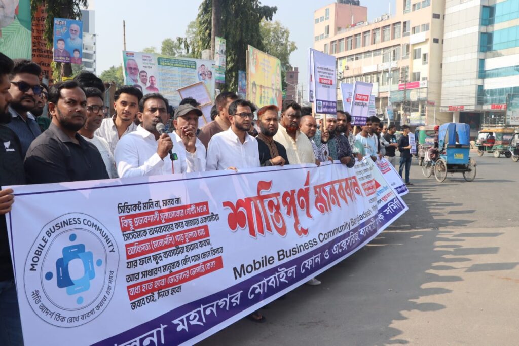 খুলনা মহানগর মোবাইল ফোন অ্যাক্সেসরিজ ব্যবসায়ী সমিতির সভাপতি কায়েসুল আজাদ শাকিলের সভাপতিত্বে ও সাধারণ সম্পাদক কামরুল ইসলাম পল্টুর পরিচালনায় মানববন্ধনে বক্তব্য রাখেন আমিনুল ইসলাম রনি, খোরশেদ আলম, মাকসুদ রানা মুরাদ, মো. নুর ইসলাম সরদার, আজিজুল আমিন, ইমরান হাসান, মো. বেলাল হোসেন, নিহাল আহম্মদ হিরা, মোস্তফা কামাল, শাহনাজ আলী জনি প্রমুখ।