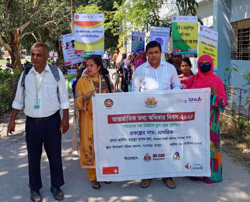 ‘পরিবেশের তথ্য ডিজিটাল যুগে হোক সুনিশ্চিত’ এ প্রতিপাদ্যে রংপুরের গঙ্গাচড়ায় আন্তর্জাতিক তথ্য অধিকার দিবস পালন করা হয়েছে। ন্যাশনাল অ্যাডভান্সমেন্ট ফর গর্ভনেন্স অ্যান্ড রাইটস ইনিশিয়েটিভস ইন কমিউনিটিস (নাগরিক প্রকল্প) এর আওতায় ও আমরাই পারি পারিবারিক নির্যাতন প্রতিরোধ জোট এবং সোস্যাল ইক্যুআলিটি ফর ইফেকটিভ ডেভেলপমেন্ট (সীড) এর আয়োজনে রোববার দিবসটি উপলক্ষে র্যালি ও আলোচনা সভা অনুষ্ঠিত হয়। এতে প্রধান অতিথি হিসেবে উপস্থিত ছিলেন উপজেলা নির্বাহী অফিসার মাহমুদ হাসান মৃধার প্রতিনিধি হিসেবে উপজেলা প্রকল্প বাস্তবায়ন কর্মকর্তা (পিআইও) সজীবুল করিম। উপজেলা প্রশাসনের হলরুমে অনুষ্ঠিত আলোচনা সভায় শুভেচ্ছা বক্তব্য, আন্তর্জাতিক তথ্য অধিকার দিবসের তাৎপর্য সমন্ধে ও বাস্তবায়নকারী সংস্থা সীড সমন্ধে উপস্থাপন করেন প্রকল্প (সীড-ইকুইপস প্রকল্প) সমন্বয়কারী আব্দুল জলিল। নাগরিক প্রকল্পের লক্ষ্য, উদ্দেশ্য ও কার্যক্রম উপস্থাপন করেন প্রজেক্ট অফিসার (নাগরিক প্রকল্প) ফারজানা জামান। বিশেষ অতিথির বক্তব্য রাখেন ডেমক্রেসিওয়াচ ফেসিং প্রকল্পের নাগরিক প্লাটফর্ম গঙ্গাচড়ার আহবায়ক সাংবাদিক আব্দুল বারী স্বপন, নাগরিক প্রকল্পের নাগরিক প্লাটফর্মের সহ-সভাপতি আজমিরা আক্তার, সদস্য রশিদুল ইসলাম। সভায় অংশগ্রহণকারীগণ উম্মুক্ত আলোচনা করেন। এর আগে একটি র্যালি উপজেলা পরিষদ চত্বর থেকে বের হয়ে গুরুত্বপূর্ণ সড়ক প্রদক্ষিণ করে।
