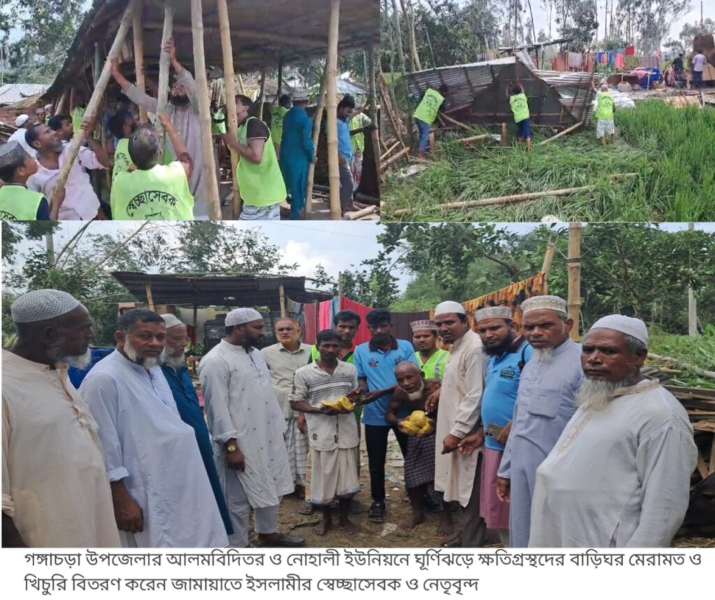 গঙ্গাচড়া উপজেলার আলমবিদিত ও নোহালী ইউনিয়নের ওপর দিয়ে বয়ে যাওয়া প্রলয়ঙ্কারী ঘুর্ণিঝড়ে ক্ষতিগ্রস্ত পরিবারের বাড়িঘর মেরামত, রাস্তা-ঘাট, গাছপালা সরিয়ে দেয়ার কাজ সোমবার সকাল ৯ টা থেকে শেষ বিকাল পর্যন্ত বাংলাদেশ জামায়াতে ইসলামী গঙ্গাচড়া উপজেলার দুই শতাধিক স্বেচ্ছাসেবক কাজ করে। এছাড়া তারা ১৫০০ জনের মাঝে রান্না করা খিচুরি বিতরণ করেন। এ সময় সার্বক্ষণিক উপস্থিত কাজের তদারকি ও লোকজনের বিভিন্ন বিষয়ে খোঁজ খবর নেন বাংলাদেশ জামায়াতে ইসলামী মনোনীত রংপুর-০১ আসনের এমপি প্রার্থী জননেতা মোঃ রায়হান সিরাজী, গঙ্গাচড়া উপজেলা জামায়াতের আমীর মাওলানা মোঃ নায়েবুজ্জামান, সেক্রেটারি মাওলানা মোঃ সাইফুল ইসলাম, সহকারী সেক্রেটারি মাওলানা আব্দুল হালিম, শ্রমিক নেতা মাওলানা ওবায়দুর রহমান, আলমবিদিতর ইউনিয়ন জামায়াতের আমীর মাওলানা মোঃ সামিউল ইসলাম, সেক্রেটারি মোত্তালিব হোসাইনসহ জামায়াতের বিভিন্ন পর্যায়ের নেতৃবৃন্দ।