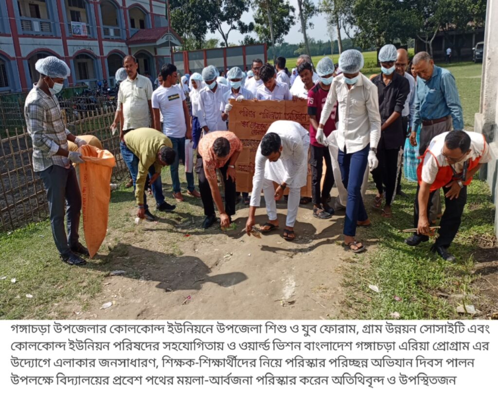 রংপুরের গঙ্গাচড়া উপজেলার কোলকোন্দ ইউনিয়নে পরিস্কার পরিচ্ছন্ন অভিযান দিবস পালন করা হয়েছে। উপজেলা শিশু ও যুব ফোরাম, গ্রাম উন্নয়ন সোসাইটি এবং কোলকোন্দ ইউনিয়ন পরিষদের সহযোগিতায় ও ওয়ার্ল্ড ভিশন বাংলাদেশ গঙ্গাচড়া এরিয়া প্রোগ্রাম এর উদ্যোগে এলাকার জনসাধারণ, শিক্ষক-শিক্ষার্থীদের নিয়ে পরিস্কার পরিচ্ছন্ন অভিযান দিবস পালন উপলক্ষে বৃহস্পতিবার কোলকোন্দ আব্দুস ছামাদ উচ্চ বিদ্যালয় মাঠে আলোচনা সভা অনুষ্ঠিত হয়। অনুষ্ঠানে ওয়ার্ল্ড ভিশন বাংলাদেশ নর্দান বাংলাদেশ ক্লাস্টারের ডিপুটি ডিরেক্টর রাজু রোজারিও প্রধান অতিথি হিসাবে এ পরিস্কার পরিচ্ছন্ন অভিযান দিবস উদ্বোধন করেন এবং তিনি বলেন, একটি পরিষ্কার পরিবেশ মানে হলো সুস্থ মানুষ, সমৃদ্ধ প্রকৃতি ও টেকসই ভবিষ্যৎ। মানব উন্নয়ন ও পরিবেশ সংরক্ষণের মধ্যে ভারসাম্য রক্ষার জন্য এটি অপরিহার্য। অভিযানে উপস্থিত সবাইকে যার যার অবস্থান হতে পরিবেশ পরিচ্ছন্নতার মাধ্যমে সুস্থ্য ও সুন্দর পরিবেশ উন্নয়ন ভূমিকা রাখার জন্য অনুরোধ জানান। ওয়ার্ল্ড ভিশন বাংলাদেশ গঙ্গাচড়া এপির এরিয়া ম্যানেজার লিওবার্ট চিসিমের সভাপতিত্বে অনুষ্ঠানে উপস্থিত ছিলেন রংপুর এরিয়া কো-অর্ডিনেশন অফিসের সিনিয়র ম্যানেজার উত্তম দাস, কোলকোন্দ ইউনিয়ন পরিষদের ভারপ্রাপ্ত চেয়্যারম্যান শরিফুল ইসলাম, আব্দুস ছামাদ উচ্চ বিদ্যালয়ের প্রধান শিক্ষক মজিবুর রহমান, যুব ফোরামের সভাপতি নাজিরুল ইসলাম, ভিডিএস সভাপতি খালেদা বেগমসহ সংস্থার অন্যান্য কর্মকর্তা, সাংবাদিক, শিশু ও যুব প্রতিনিধি, স্থানীয় জনপ্রতিনিধি এবং জনসাধারণ উপস্থিত ছিলেন। অনুষ্ঠানে পরিস্কার পরিচ্ছন্ন অভিযান দিবসের মাধ্যমে উন্নত স্বাস্থ্য, পরিবশে সুরক্ষা, নিরাপদ ও স্বাস্থ্যকর পরিবেশ সৃষ্টির মাধ্যমে জনসচেতনতা আনায়ন ও দায়িত্ববোধ গড়ে তোলা এবং স্বাস্থ্যকর আবাস্থল বজায় রাখতে জনগনকে সচেতন করা। আলোচনা শেষে অতিথিবৃন্দসহ উপস্থিত সকলে বিদ্যালয়ের মাঠে ও প্রবেশের রাস্তায় ময়লা-আর্বজনা পরিস্কার করে নির্দিষ্টস্থানে ফেলান।