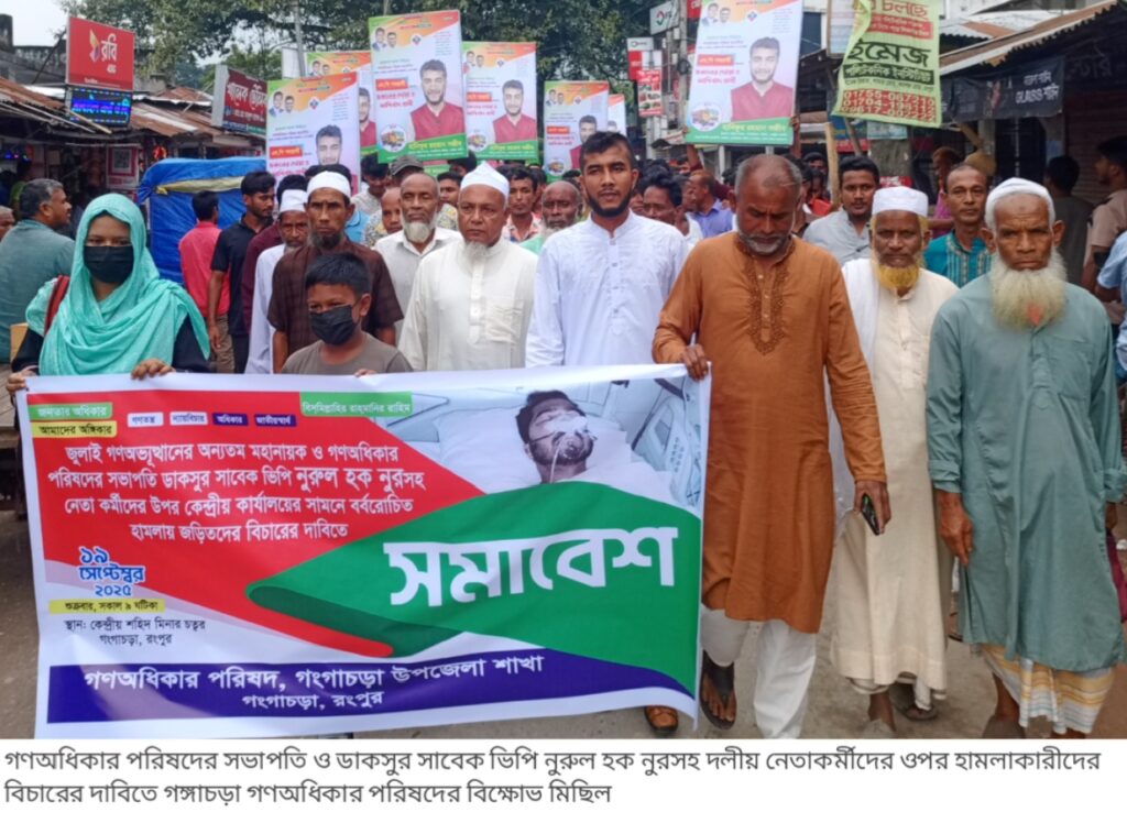 গণঅধিকার পরিষদের সভাপতি ও ডাকসুর সাবেক ভিপি নুরুল হক নুরসহ দলীয় নেতাকর্মীদের ওপর বর্বচিত হামলাকারীদের বিচারের দাবিতে গঙ্গাচড়া গণঅধিকার পরিষদের উদ্যোগে সমাবেশ ও বিক্ষোভ মিছিল করেছে। শুক্রবার সকাল ১০ টায় উপজেলা কেন্দ্রীয় শহিদ মিনার চত্বরে সমাবেশে প্রধান অতিথি হিসেবে উপস্থিত ছিলেন গণঅধিকার পরিষদের উচ্চতর সদস্য ও রংপুর-১ আসনের সংসদ সদস্য মনোনীত প্রার্থী হানিফুর রহমান সজীব। গণঅধিকার পরিষদের জেলা সভাপতি শেরে খোদা আসাদুল্লাহ এর সভাপতিত্বে সমাবেশে বক্তব্য রাখেন জেলা শাখার সাধারণ সম্পাদক তোফায়েল আহমেদ তুষার, সাংগঠনিক সম্পাদক রুবেল হোসেন, সহসাধারণ সম্পাদক সজীব মিয়া, দপ্তর সম্পাদক ফাইমুল ইসলাম, গঙ্গাচড়া শাখার সাবেক সদস্য সচিব মোত্তালেব হোসেন, গঙ্গাচড়া ছাত্র অধিকার পরিষদের সাধারণ সম্পাদক মাহফুজ আলম প্রমুখ। সমাবেশ শেষে একটি বিক্ষোভ মিছিল গঙ্গাচড়া বাজার এলাকার গুরুত্বপূর্ণ সড়ক প্রদক্ষিণ করে। সমাবেশে হানিফুর রহমান সজীব বলেন, দেশের মানুষ আর ফ্যাসিবাদ ও তাদের দোসরদের চায়না এবং তাদেরমত কোন রাজনৈতিক দলকেও চায়না। মানুষ তারুণ্যের মাধ্যমে আগামীর বাংলাদেশ গড়তে চায়। তারুণ্যের দল গণঅধিকার পরিষদ। এদলের সভাপতি দেশের মানুষের কল্যাণে লড়াই সংগ্রাম করতে গিয়ে ফ্যাসিবাদের রোষানলে পড়ে বার হামলার শিকার হয়েছে এবং কারাবন্দী হয়েছে। ফ্যাসিবাদ হঠানোর অন্যতম নায়ককে এখনও হামলা করা হচ্ছে। যা কোনভাবে মেনে নেয়া যায়না। তাদের দোসরা পরিকল্পিতভাবে এ ধরনের ন্যাক্কারজনক কাজ করছে। তাদের সকলকে বিচারের আনার দাবি জানান। এছাড়া তিনি আরো বলেন, উন্নয়নের নামে লুটপাট করা ফ্যাসিবাদের সময় পরিকল্পিতভাবে গঙ্গাচড়া উপজেলার উন্নয়ন হয়নি। তিনি নির্বাচিত হলে শিক্ষা, স্বাস্থ্য, কৃষি, অবকাঠামো, কর্মসংস্থানের ব্যবস্থাসহ তিস্তা মহাপরিকল্পনা বাস্তবায়নে গুরুত্ব দিবেন।