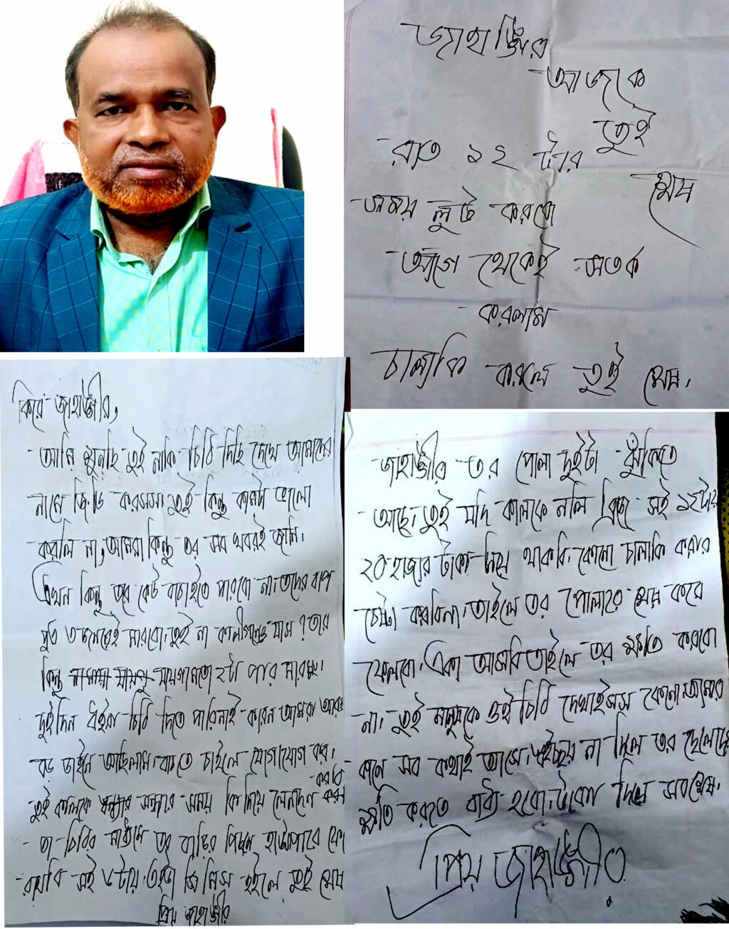 চিরকুট ও অভিযোগ সূত্রে জানা যায়, গত ২৪ ডিসেম্বর রাতে কে বা কাহারা জাহাঙ্গিরের ঘরের দরজার সামনে চিরকুট ফেলে রেখে যায়। পরের দিন অর্থাৎ ২৫ তারিখ মঙ্গলবার সকালে ঘুম থেকে উঠে দরজার সামনে মাটিতে চিরকুটটি দেখতে পায়। চিরকুটের মাধ্যমে হুমকি দিলে জাহাঙ্গির বাদী হয়ে গত ২৫ ডিসেম্বর নিকটস্থ থানায় অজ্ঞাতনামা ব্যক্তিদের বিরুদ্ধে লিখিত অভিযোগ দায়ের করেন। ২৪ তারিখের প্রথম চিরকুটে “জাহাঙ্গির আজকে তুই শেষ” রাত ১২ টার সময় লুট করবো, আগে থেকেই সতর্ক করলাম, চালাকী করলে তুই শেষ। চিরকুটে এসবই লেখা ছিল।