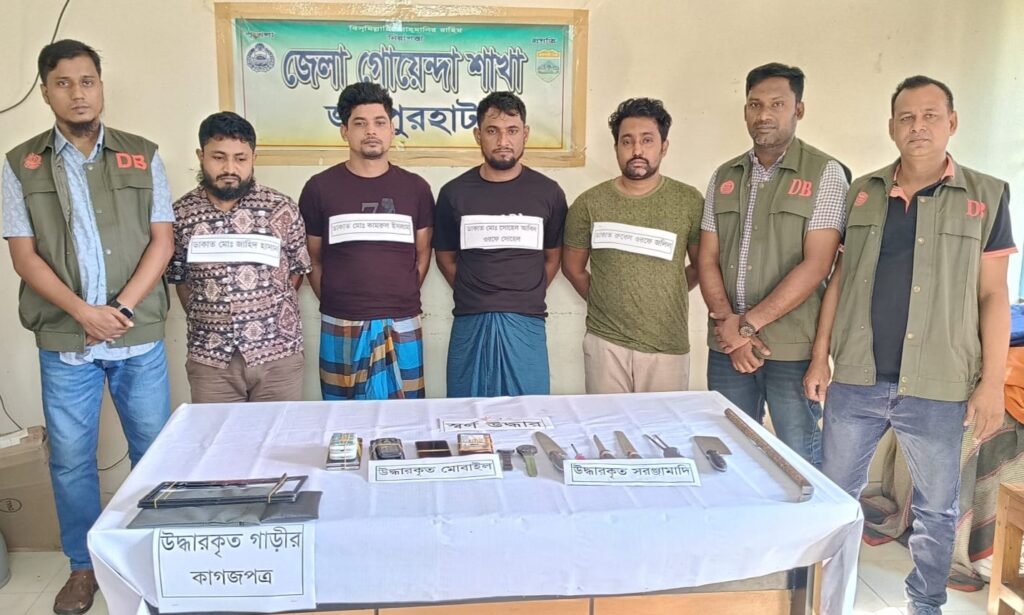 জয়পুরহাটে আন্তঃজেলা ডাকাত দলের ৪ সদস্যকে গ্রেপ্তার করেছে পুলিশ। এ সময় ডাকাতি হওয়া মালামালসহ ডাকাতির কাজে ব্যবহৃত বিভিন্ন অস্ত্র ও সরঞ্জামাদি উদ্ধার করা হয়। শনিবার দুপুরে নিজ সম্মেলন কক্ষে এক প্রেস ব্রিফিংয়ে জয়পুরহাট পুলিশ সুপার মুহম্মদ আবদুল ওয়াহাব এ তথ্য জানান।