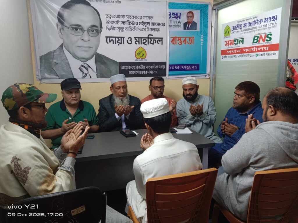 ব্যারিস্টার মইনুল হোসেনের দ্বিতীয় মৃত্যুবার্ষিকী যথাযোগ্য মর্যাদা ও শ্রদ্ধার সঙ্গে পালিত হয়েছে। মঙ্গলবার ০৯ ডিসেম্বর ২০২৫ রাজধানীর জাতীয় সাংবাদিক সংস্থা কেন্দ্রীয় কার্যালয়ে এ উপলক্ষে কোরআন তেলাওয়াত ও দোয়া মাহফিলের আয়োজন করা হয়।