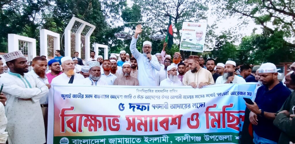 জুলাই সনদের ভিত্তিতে জাতীয় নির্বাচন অনুষ্ঠানসহ ৫ দফা দাবিতে উপজেলা জামায়াত ইসলামী বিক্ষোভ সমাবেশ করেছে। কালীগঞ্জ উপজেলা জামায়াতে ইসলামী এই বিক্ষোভ সমাবেশের আয়োজন করেন।