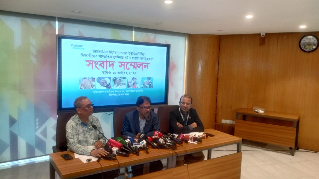 মঙ্গলবার (২৮ অক্টোবর) দুপুরে ড্যাফোডিল বিশ্ববিদ্যালয়ের কনফারেন্স রুমে আয়োজিত সংবাদ সম্মেলনে এ অভিযোগ তুলেন তিনি।