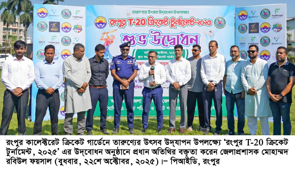 তারুণ্যের উৎসব উদ্যাপন উপলক্ষ্যে রংপুরে টি-টোয়েন্টি ক্রিকেট টুর্নামেন্টের উদ্বোধন করা হয়েছে। বুধবার (২২শে অক্টোবর) দুপুরে রংপুর কালেক্টরেট ক্রিকেট গার্ডেনে প্রধান অতিথি হিসাবে উপস্থিত থেকে বেলুন উড়িয়ে টুর্নামেন্টের উদ্বোধন করেন রংপুরের জেলাপ্রশাসক ও জেলা ক্রীড়া সংস্থার আহ্বায়ক মোহাম্মদ রবিউল ফয়সাল। অনুষ্ঠানে সভাপতিত্ব করেন রংপুরের অতিরিক্ত জেলাপ্রশাসক (সার্বিক) মোঃ রমিজ আলম। রংপুর জেলাপ্রশাসন ও জেলা ক্রীড়া সংস্থা এই টুর্নামেন্ট আয়োজন করে।