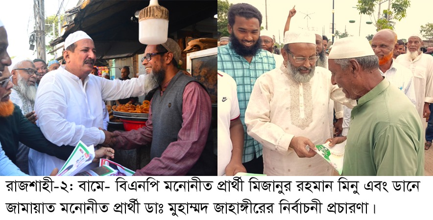 আসন্ন ত্রয়োদশ জাতীয় সংসদ নির্বাচনকে কেন্দ্র করে রাজশাহীর ভোটের মাঠ সরগরম হয়ে উঠেছে। রাজশাহীর সংসদীয় ৬ টি আসনেই প্রধান প্রতিদ্বন্দ্বী বিএনপি-জামায়াত। বিএনপির প্রার্থী ঘোষণার পর থেকেই ৪ টি আসনে তীব্র হয়েছে দলীয় কোন্দল। প্রার্থী পরিবর্তনের দাবিতে স্থানীয় বিএনপির ৪টি আসনের নেতা-কর্মীরা মাথায় কাফনের কাপড় বেঁধে বিক্ষোভ, সড়ক অবরোধ এমন কি রক্তক্ষয়ী সংঘর্ষে জড়িয়েছে। এনিয়ে অভ্যন্তরীণ কোন্দলে বিপর্যস্থ অবস্থায় রয়েছে বিএনপি। অপর দিকে সাংগঠনিকভাবে শক্ত অবস্থানে থেকে নির্বাচনী প্রচার ও প্রস্তুতিতে সার্বিকভাবে এগিয়ে রয়েছে জামায়াত। রাজশাহী জুড়ে প্রার্থীরা জনসংযোগ, ব্যানার, ফেসটুনসহ পোষ্টারের মাধ্যমে নির্বাচনী প্রচারণা চালিয়ে যাচ্ছেন। গণসংযোগকালে তারা ভোটারদের দ্বারে দ্বারে গিয়ে ধানের শীষ ও দাঁড়িপাল্লার পক্ষে ভোট ও সমর্থন প্রার্থনা করছেন।