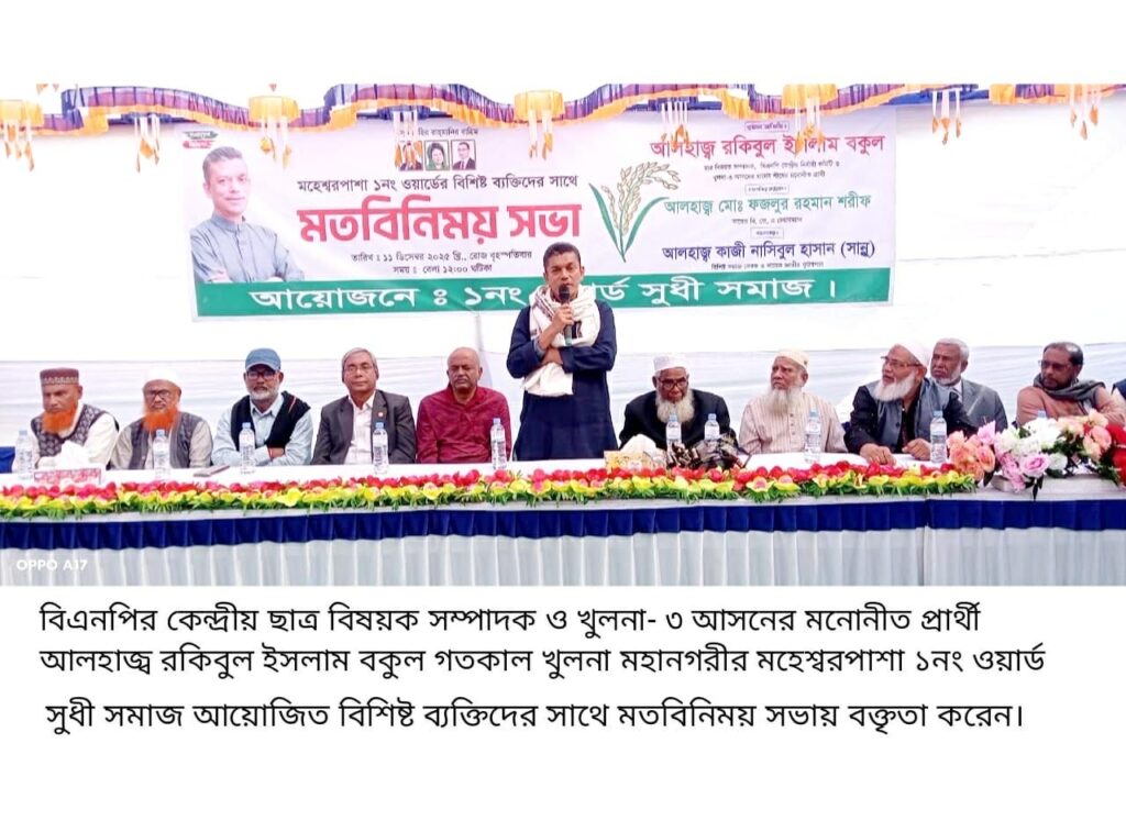 বিএনপির কেন্দ্রীয় নির্বাহী কমিটির ছাত্রবিষয়ক সম্পাদক ও খুলনা-৩ আসনের ধানের শীষের প্রার্থী রকিবুল ইসলাম বকুল বলেছেন, মানুষের সেবা করতে গিয়ে তিনি কখনো দল–মতের পার্থক্য বিবেচনা করেননি। তিনি বলেন,করোনার সময় যখন কেউ দাফন–কাফনে এগোতে সাহস পাইনি, তখন আমরা ঘরে ঘরে অক্সিজেন,খাবার ও চিকিৎসাসামগ্রী পৌঁছে দিয়েছি। কে কোন দলের এটা কখনো ভাবিনি। ভবিষ্যতেও খুলনা-৩ আসনকে বৈষম্যহীন ও আধুনিক জনপদে রূপান্তর করতে চাই।বৃহস্পতিবার দুপুরে খুলনা মহানগরীর মহেশ্বরপাশা ১নং ওয়ার্ড সুধী সমাজ আয়োজিত মতবিনিময় সভায় প্রধান অতিথির বক্তব্যে তিনি এসব বলেন।