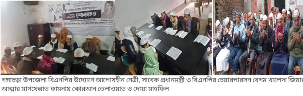 সাবেক ৩ বারের প্রধানমন্ত্রী, গণতন্ত্রের আপোষহীন নেত্রী, দেশনেত্রী বিএনপির চেয়ারপারসন বেগম খালেদা জিয়ার আত্মার মাগফেরাত কামনায় গঙ্গাচড়া উপজেলা বিএনপির উদ্যোগে উপজেলা বিএনপি কার্যালয়ে কোরআন তেলাওয়াত ও দোয়া মাহফিলের আয়োজন করা হয়। এছাড়া দলীয় কার্যালয়ে জাতীয় ও দলীয় পতাকা অর্ধনির্মিত রাখা হয়। নেতাকর্মী, সমর্থক ও শুভাকাঙ্খীগণ কালো ব্যাচ ধারণ করেন। মঙ্গলবার সকালে প্রিয় নেত্রী খালেদা জিয়ার ইন্তেকালের পর দলের ৭ দিনের কর্মসূচি ও সরকারের কর্মসূচি ঘোষণা পরই গঙ্গাচড়া উপজেলা বিএনপির উদ্যোগে কর্মসূচি পালন শুরু করে। মঙ্গলবার কোরআন খতমে তেলওয়াত শেষে দোয়া মাহফিল করা হয়। বুধবারও কোরআন খতম ও দোয়া মাহফিল করা হয়। উপজেলা বিএনপির সভাপতি চাঁদ সরকার ও সাধারণ সম্পাদক আইয়ুব আলী বলেন, একজন আপোষহীন নেত্রী, যিনি গণতন্ত্রের নেত্রী, সফল ৩ বারের প্রধানমন্ত্রী দেশের গণমানুষের আস্থাভাজন ও দক্ষ দলের চেয়ারপারসন হিসেবে দলকে গণমানুষের দলে পরিনত করেছেন। ওনার ইন্তেকালে দেশবাসী একজন সফল অভিভাবক হারালো। ওনার আত্মার মাগফেরাত কামনায় কোরআন তেলাওয়াত ও দোয়া মাহফিল করা হচ্ছে। উপজেলা বিএনপির সাংগঠনিক দায়িত্ব প্রাপ্ত সদস্য গোলাম রব্বানী রঞ্জু বলেন, মহাকালের সমাপ্তিতে দলের কর্মসূচি সফলভাবে পালন করা হবে। অন্যদিকে বাংলাদেশ হিন্দু, বৌদ্ধ, খ্রীস্টান কল্যান ফ্রন্ট গঙ্গাচড়া উপজেলা শাখার উদ্যোগে ও অঙ্গ সহযোগী সংগঠনের পক্ষে কর্মসূচি পালন করা হচ্ছে। এদিকে প্রিয় নেত্রীর জানাজায় অংশ নিতে এমপি প্রার্থী মোকাররম হোসেন সুজনসহ দলীয় অনেক নেতাকর্মী ঢাকায় মঙ্গলবার রাতে ঢাকায় চলে গেছেন।