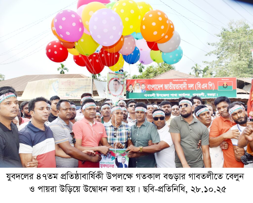 দিনব্যাপী নানা কর্মসূচির মধ্যে দিয়ে ২৮শে অক্টোবর-২৫ মঙ্গলবার বাংলাদেশ জাতীয়তাবাদী যুবদল এর ৪৭তম প্রতিষ্ঠা বার্ষিকী উপলক্ষে বগুড়ার গাবতলী উপজেলা ও পৌর যুবদলের উদ্যোগে একটি বিশাল বর্ণাঢ্য র্যালী বের করা হয়।