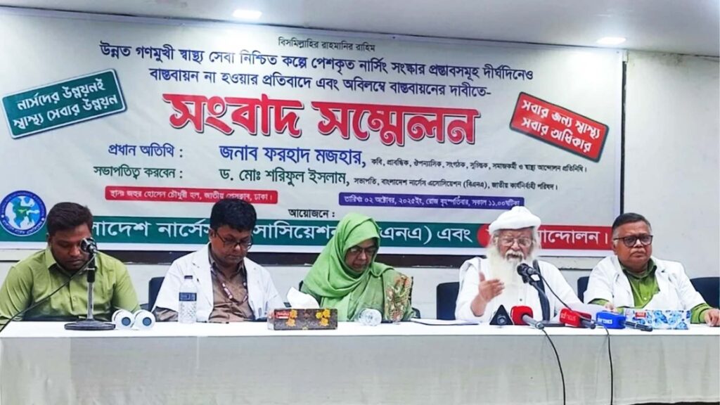 বৃহস্পতিবার (২ অক্টোবর) জাতীয় প্রেস ক্লাবের জহুর হোসেন চৌধুরী হলে বাংলাদেশ নার্সেস অ্যাসোসিয়েশন (বিএনএ) আয়োজিত এক সংবাদ সম্মেলনে তিনি এসব কথা বলেন। উন্নত ও গণমুখী স্বাস্থ্যসেবা নিশ্চিতে নার্সিং সংস্কার বাস্তবায়নের দাবি জানাতে এ আয়োজন করা হয়।