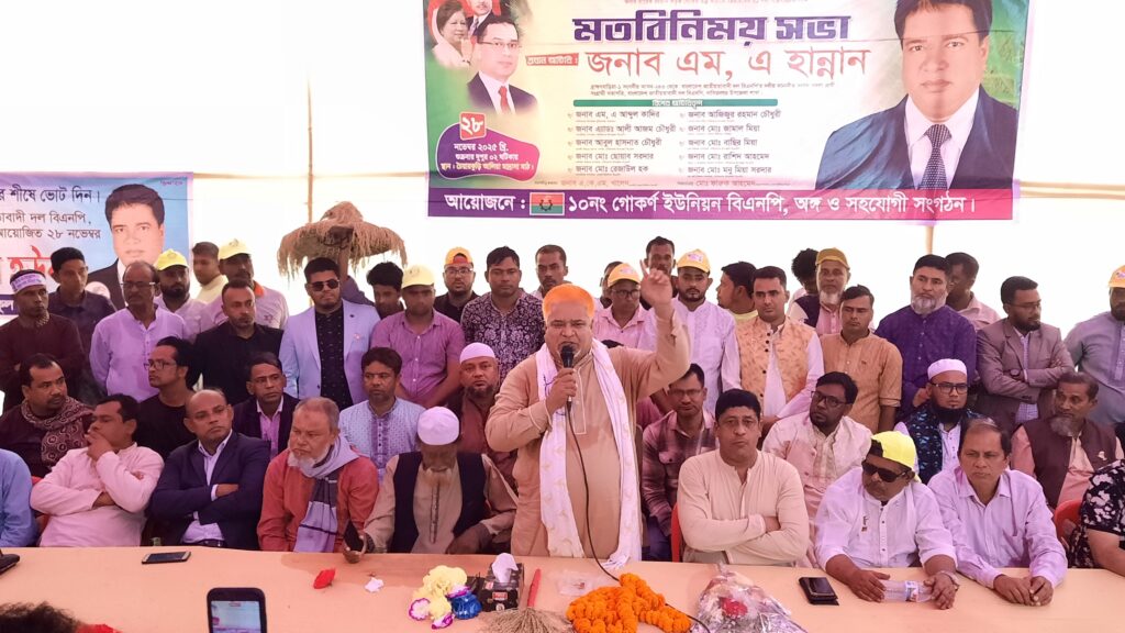 আজ শুক্রবার  বিকালে গোকর্ণ ইউনিয়ন বিএনপি ও অঙ্গসংগঠনের উদ্যোগে স্থানীয় মাদ্রাসা সংলগ্ন মাঠে এই মতবিনিময় সভা  অনুষ্ঠিত হয়। সভায় প্রধান অতিথি ছিলেন  ব্রাহ্মণবাড়িয়া-১ আসনের বিএনপির মনোনীত সংসদ সদস্য প্রার্থী  ও উপজেলা বিএনপির সভাপতি এম এ হান্নান। এসময় তিনি বলেন  বিএনপির ভারপ্রাপ্ত চেয়ারম্যান তারেক রহমানের রাষ্ট্রকাঠামো মেরামতের ৩১ দফা সংস্কার বাস্তবায়নে সকলকে ভেদাভেদ ভুলে ঐক্যবদ্ধ হয়ে আগামী সংসদ নির্বাচনে ধানের শীষের প্রার্থীকে বিজয়ী করে বাংলাদেশ জাতীয়তাবাদী দল বিএনপিকে ক্ষমতায় আনতে হবে।
