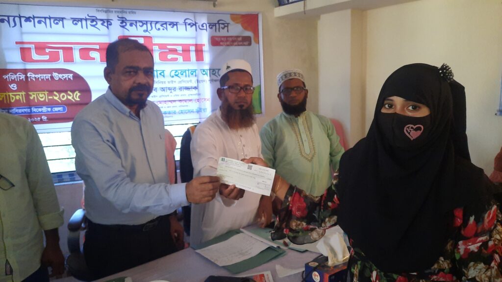 শনাল লাইফ ইনস্যুরেন্স কোম্পানী লিমিটেড জনবীমা নাসিরনগর বিকেন্দ্রীক জেলার উদ্যোগে আজ বুধবার দিনব্যাপী পলিসি বিপনন উৎসব,ব্যবসা পর্যালোচনা সভা ও দাবী চেক বিতরণ অনুষ্ঠিত হয়েছে । নাসিরনগর বিকেন্দ্রীক জেলার সহকারী এরিয়া ইনচার্জ মোঃ কামাল হোসেনের সভাপতিত্বে সহকারী জোন প্রধান আকতার হোসেন ভুইয়ার সঞ্চালনায় অনুষ্ঠিত সভায় প্রধান অতিথি ছিলেন কোম্পানির সিনিয়র ভাইস প্রেসিডেন্ট (উন্নয়ন)পূর্বাঞ্চল জনাব হেলাল আহমেদ । বিশেষ অতিথি ছিলেন কোম্পানির সহকারী ভাইস প্রেসিডেন্ট ও ব্রাহ্মণবাড়িয়া- ১৯ এরিয়া ইনর্চাজ মোহাম্মদ আবদুর রাজ্জাক । সভায় প্রধান অতিথি বলেছেন, ন্যাশনাল লাইফ ইন্স্যুরেন্স কোম্পানি গ্রাহকের বীমা দাবি পরিশোধে সব সময় অগ্রাধিকার দিয়ে আসছে। ন্যাশনাল লাইফ ইন্স্যুরেন্স কোম্পানি গ্রাহকদের সেবার মান নিশ্চিত করতে প্রতিনিয়ত কাজ করে যাচ্ছেন। সব পেশার সেরা পেশা হচ্ছে বীমা। এসময় কর্মীদের সঠিক সুন্দর দিক নির্দেশনা ও পরামর্শ প্রদান করেন।
