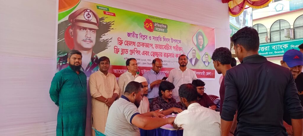ঐতিহাসিক ৭ নভেম্বর জাতীয় বিপ্লব ও সংহতি দিবস উপলক্ষে নীলফামারীতে ফ্রি মেডিকেল ক্যাম্প ও স্বাস্থ্য পরীক্ষা কর্মসূচি আয়োজন করেছে ডক্টরস অ্যাসোসিয়েশন অব বাংলাদেশ (ড্যাব) নীলফামারী জেলা শাখা। জেলা বিএনপির সহযোগিতায় আয়োজিত এ কর্মসূচিতে বিনামূল্যে ডায়াবেটিস, উচ্চ রক্তচাপ, রক্তের গ্রুপ পরীক্ষা এবং স্বেচ্ছায় রক্তদান কার্যক্রম অনুষ্ঠিত হয়।
