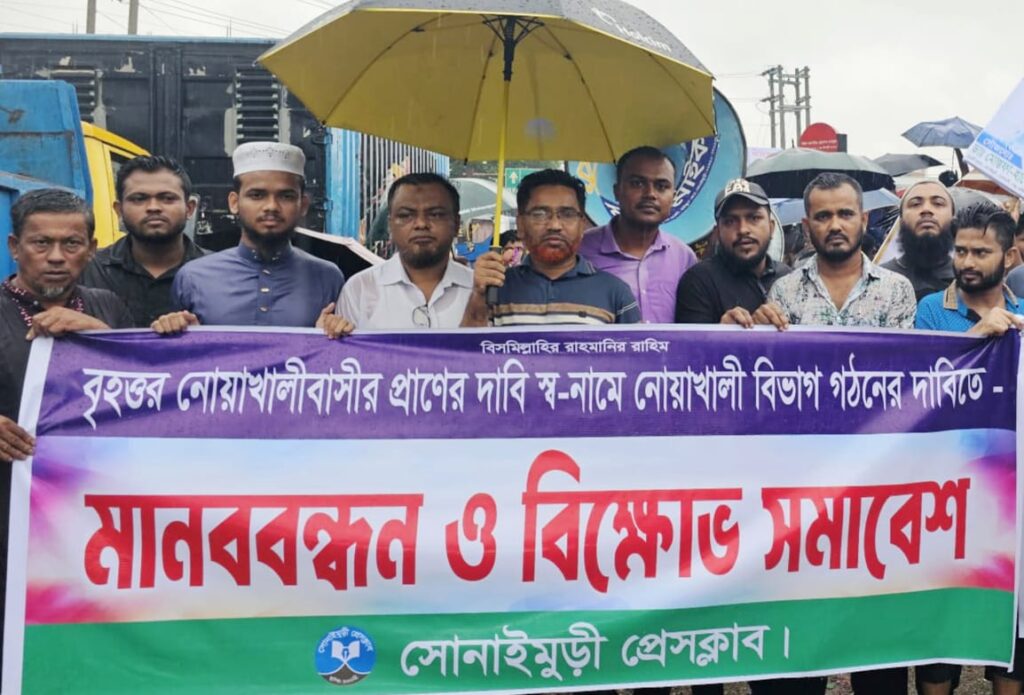 বৃহস্পতিবার (২ অক্টোবর) দুপুরে সোনাইমুড়ী উপজেলাবাসীর ব্যানারে এ কর্মসূচীর আয়োজন করা হয়। বৃষ্টি উপেক্ষা করে বৃহত্তর নোয়াখালীবাসীর প্রাণের দাবী নোয়াখালী বিভাগের দাবীতে বিভিন্ন শ্রেণি-পেশার হাজার হাজার মানুষ জড়ো হয় বাইপাস চত্ত্বরে। এ সময় বিক্ষোভকারীরা ঢাকা-নোয়াখালী ফোরলেন সড়ক অবরোধ করে যানচলাচল বন্ধ করে দেয়। ২ ঘন্টাব্যাপী বিক্ষোভে সড়কে দীর্ঘ যানজটের সৃষ্টি হয়। মানববন্ধনে সংহতি প্রকাশ করেন ডাঃ মোস্তফা হাজেরা ফাউন্ডেশন, সোনাইমুড়ী প্রেসক্লাবসহ বিভিন্ন সামাজিক সংগঠন ও রাজনৈতিক ব্যক্তিবর্গ।