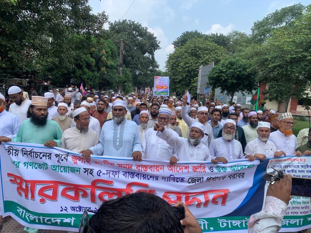 ৫ দফা দাবিগুলো হল- জুলাই জাতীয় সনদের ভিত্তিতে ফেব্রুয়ারিতে নির্বাচন, জাতীয় নির্বাচনে পিআর পদ্ধতি চালু, লেভেল প্লেয়িং ফিল্ড নিশ্চিত করা, ফ্যাসিস্ট সরকারের জুলুম-নির্যাতন ও দুর্নীতির বিচার এবং জাতীয় পার্টি ও ১৪ দলের কার্যক্রম নিষিদ্ধ করা।