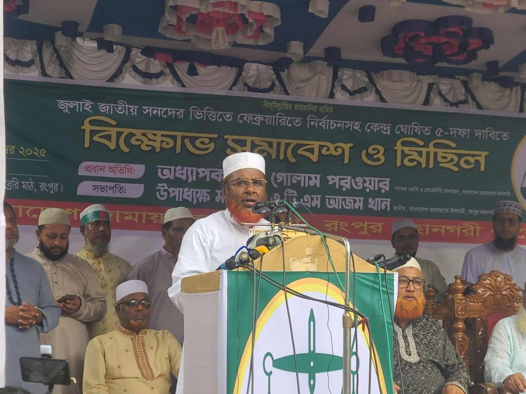 গতকাল শুক্রবার তিনি বিকেলে বাংলাদেশ জামায়াতে ইসলামী রংপুর মহানগর শাখার উদ্যোগে স্থানীয় পাবলিক লাইব্রেরী মাঠে জুলাই জাতীয় সনদের ভিত্তিতে ফেব্রুয়ারীতে নির্বাচনসহ ৫ দফা দাবীতে আয়োজিত বিক্ষোভ পুর্ব সমাবেশে প্রধান অতিথির বক্তব্যে একথা বলেন।