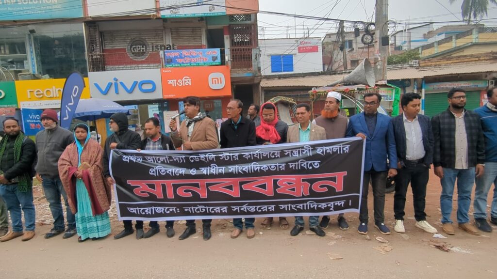 হাদি হত্যার প্রতিবাদ করতে গিয়ে প্রথম আলো ও ডেইলি স্টার অফিসে হামলা অগ্নি সংযোগ এবং লুটপাটের প্রতিবাদে নাটোরে মানব বন্ধন ও প্রতিবাদ সমাবেশ করেছে জেলা পর্যায়ে কর্মরত বিভিন্ন প্রিন্ট ও ইলেক্ট্রনিক্স্র মিডিয়ার কর্মরত সাংবাদিকরা।