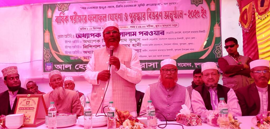 প্রতিষ্ঠাতা পরিচালক মাওলানা আব্দুল গফুরের সভাপতিত্বে অনুষ্ঠানে বিশেষ অতিথি ছিলেন খুলনা জেলা জামায়াতে ইসলামীর সেক্রেটারি মুন্সী মিজানুর রহমান, সহকারী সেক্রেটারি ও ফুলতলা উপজেলা পরিষদের সাবেক ভাইস চেয়ারম্যান প্রিন্সিপাল গাওসুল আযম হাদী, জেলা কর্মপরিষদ সদস্য এডভোকেট আবু ইউসুফ মোল্যা, ফুলতলা উপজেলা আমীর অধ্যাপক আব্দুল আলীম মোল্যা। মাদরাসা পরিচালনা পর্ষদের সেক্রেটারি সহকারী অধ্যাপক মাজহারুল ইসলামের পরিচালনায় অনুষ্ঠানে অন্যান্যের মধ্যে বক্তৃতা করেন উপজেলা প্রেসক্লাব ফুলতলার সভাপতি শামসুল আলম খোকন, দামোদর ইউনিয়ন জামায়াতে ইসলামীর আমীর ইঞ্জি. শাব্বির আহমদ, প্রতিষ্ঠান প্রধান মো. রানা হাসান, ইউপি সদস্য মো. শামীম সরদার, পরিচালনা পর্ষদের সহ-সভাপতি আব্দুল মজিদ মোল্লা, মো. রুহুল কুদ্দুস লষ্কর, যুগ্ম সাধারণ সম্পাদক মাওলানা মাছুম বিল্লাহ, দাতা সদস্য মো. গোলাম মোস্তফা গাজী, প্রভাষক খায়রুজ্জামান সরদার, শিক্ষক হাফেজ মাওলানা রেজোয়ানুল হক, মো. মঈন উদ্দিন গাজী, হাফেজ রাজিবুল ইসলাম, অনারারি ক্যাপ্টেন মো. আবুল কাশেম, আবু জাফর মিনা, মো. সেলিম জমাদ্দার, মো. আসলাম সরদার প্রমুখ। পরে প্রধান অতিথিসহ অতিথিবৃন্দ কৃতি শিক্ষার্থীদের মাঝে পুরস্কার বিতরণ করেন।