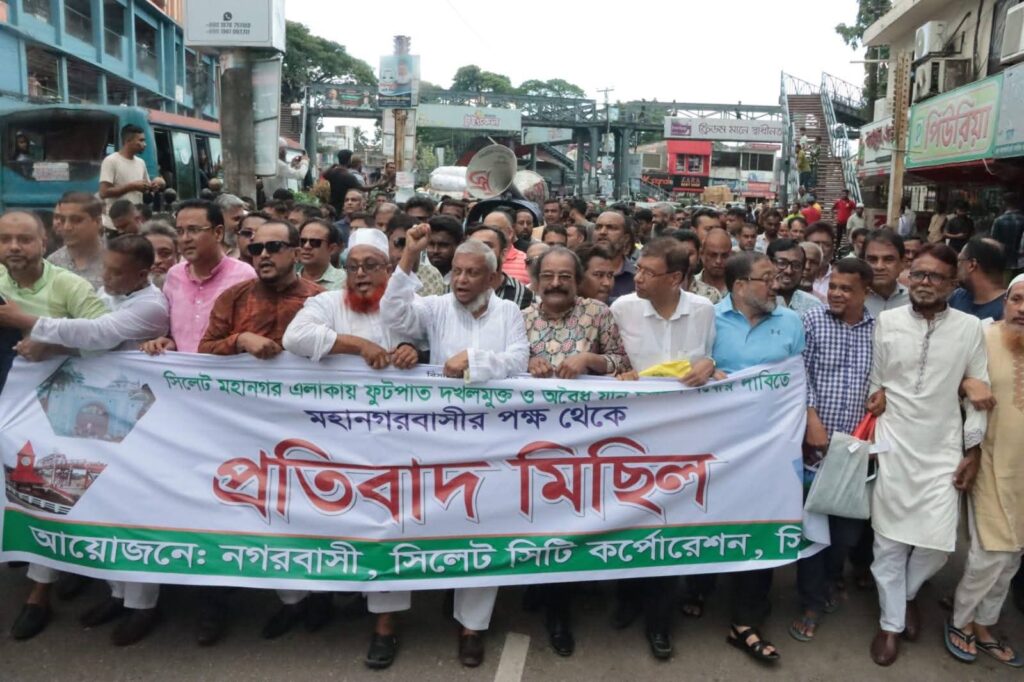 সিলেটে ফুটপাত দখলমুক্ত ও অবৈধ যানজট বন্দের দাবীতে মহানগরবাসীর পক্ষ থেকে প্রতিবাদ মিছিল অনুষ্ঠিত হয়েছে।