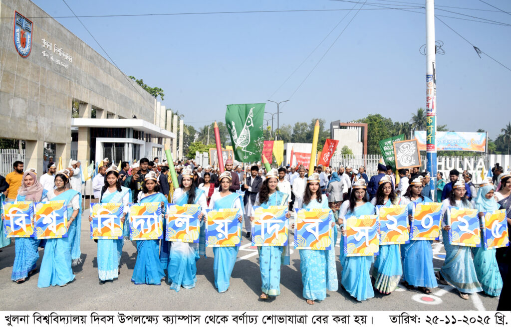 দিবসটি উপলক্ষ্যে সকাল ১০টায় বিশ্ববিদ্যালয়ের মেইন গেট ‘শহিদ মীর মুগ্ধ তোরণ’ থেকে বর্ণাঢ্য শোভাযাত্রা বের করা হয়। শোভাযাত্রাটি দ্বিতীয় গেট ঘুরে অদম্য বাংলা চত্বরে গিয়ে শেষ হয়। শোভাযাত্রায় খুলনা বিশ্ববিদ্যালয়ের প্রথম উপাচার্য প্রফেসর ড. মোঃ গোলাম রহমান এর নেতৃত্বে বর্তমান উপাচার্য প্রফেসর ড. মোঃ রেজাউল করিম, উপ-উপাচার্য প্রফেসর ড. মোঃ হারুনর রশীদ খান, ট্রেজারার প্রফেসর ড. মোঃ নূরুন্নবী এবং বিভিন্ন স্কুলের ডিন, রেজিস্ট্রার (ভারপ্রাপ্ত), ডিসিপ্লিন প্রধান, ছাত্র বিষয়ক পরিচালক, প্রভোস্ট, বিভাগীয় পরিচালকসহ শিক্ষক-শিক্ষার্থী ও কর্মকর্তা-কর্মচারীবৃন্দ অংশগ্রহণ করেন।