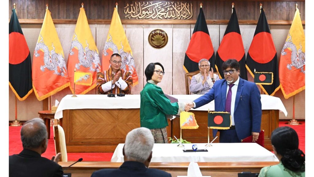 প্রধান উপদেষ্টা অধ্যাপক মুহাম্মদ ইউনূস এবং ভুটানের প্রধানমন্ত্রী শেরিং তোবগে সই অনুষ্ঠান ও নথি বিনিময় প্রত্যক্ষ করেন।