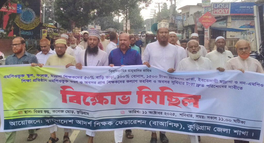 এমপিওভুক্ত স্কুল, কলেজ, মাদ্রাসা শিক্ষকদের ৫০শতাং, বাড়ি ভাড়া, ১০০শতাংশ বোনাস, ১৫০০ টাকা চিকিৎসা ভাতা, ইবতেদায়ী মাদ্রাসা ও নন-এমপিও শিক্ষা প্রতিষ্ঠান এমপিওভুক্ত করণ ও অবসর প্রাপ্ত শিক্ষকদের কল্যাণ তহবিল ও অবসর সুবিধার টাকা দ্রুত পরিশোধের দাবিতে বাংলাদেশ আদর্শ শিক্ষক ফেডারেশন কুড়িগ্রাম জেলা শাখার বিক্ষোভ মিছিল ও সমাবেশ অনুষ্ঠিত হয়।