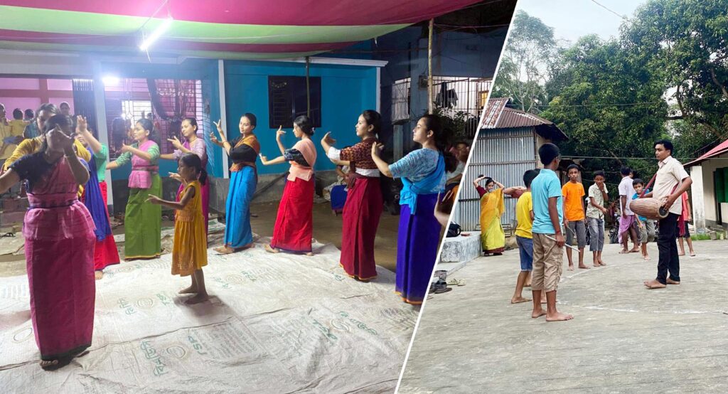 শনিবার দুপুরে ও সন্ধ্যায় কমলগঞ্জের মাধবপুর ইউনিয়নের দক্ষিণ মাঝের গাঁও এলাকায় গিয়ে দেখা যায়, পাড়াগুলোতে চলছে রাস উৎসবের মহড়া। প্রায় ১৫ দিন ধরে এখানে রাস উৎসবের মহড়া চলছে। মহড়ায় আসা মণিপুরি ছেলেমেয়েদের রাসনৃত্যের বিভিন্ন কৌশল ও নিয়মকানুন শিখিয়ে দিচ্ছিলেন রাসনৃত্যের শিক্ষক অজিত কুমার সিংহ। সঙ্গে সজল কুমার সিংহ মৃদঙ্গ বাজিয়ে ও রীনা সিংহা গান গেয়ে সেই মহড়ার তাল দিচ্ছিলেন। রাস উৎসবে এই গান ও তালের সঙ্গেই সারারাত ধরে নাচতে হবে শিল্পীদের। প্রায় ১৫-২০ জন ছেলেমেয়ে শিক্ষকদের কথা অনুযায়ী মহড়া দিচ্ছিলেন।