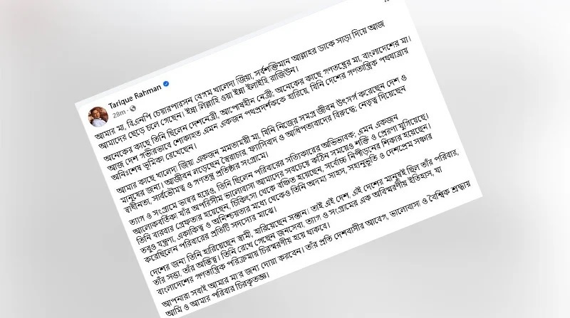 ফেসবুক পোস্টে তারেক রহমান আরও লেখেন, ‘আমার মা, বিএনপি চেয়ারপারসন বেগম খালেদা জিয়া সর্বশক্তিমান আল্লাহর ডাকে সাড়া দিয়ে আজ আমাদের ছেড়ে চলে গেছেন (ইন্না লিল্লাহি ওয়া ইন্না ইলাইহি রাজিউন)। অনেকের কাছে তিনি ছিলেন দেশনেত্রী, আপসহীন নেত্রী; অনেকের কাছে গণতন্ত্রের মা, বাংলাদেশের মা।’