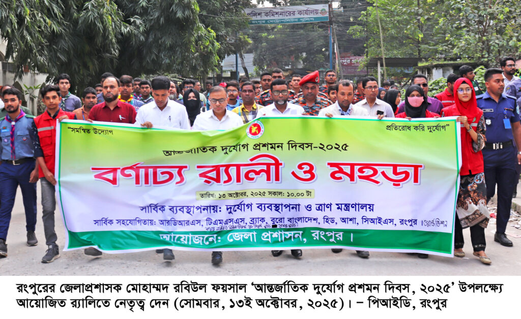 সমন্বিত উদ্যোগ, প্রতিরোধ গড়ি দুর্যোগ’—এই প্রতিপাদ্যে রংপুরে আন্তর্জাতিক দুর্যোগ প্রশমন দিবস, ২০২৫ উপলক্ষ্যে র্যালি, আলোচনাসভা ও অগ্নিকাণ্ডে করণীয় বিষয়ক মহড়া অনুষ্ঠিত হয়েছে। সোমবার (১৩ই অক্টোবর) সকালে জেলাপ্রশাসকের সম্মেলনকক্ষে অনুষ্ঠিত সভায় প্রধান অতিথি হিসাবে উপস্থিত ছিলেন রংপুরের জেলাপ্রশাসক মোহাম্মদ রবিউল ফয়সাল। রংপুর জেলাপ্রশাসন এই সভার আয়োজন করে।