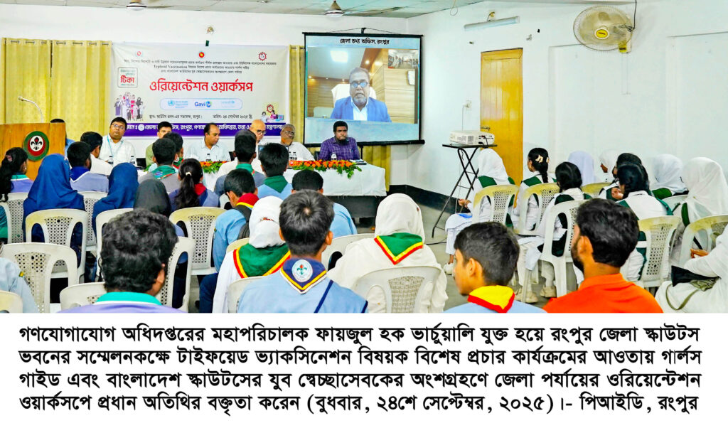 রংপুরে টাইফয়েড টিকাদানে সচেতনতা বৃদ্ধিতে একটি ওরিয়েন্টেশন ওয়ার্কশপ অনুষ্ঠিত হয়েছে। শিশু, কিশোর-কিশোরী ও নারী উন্নয়নে সচেতনতামূলক ঞুঢ়যড়রফ ঠধপপরহধঃরড়হ বিষয়ক প্রচার কার্যক্রম প্রকল্পের আওতায় গার্লস গাইড এবং বাংলাদেশ স্কাউটসের যুব স্বেচ্ছাসেবকদের অংশগ্রহণে জেলা পর্যায়ে এই ওয়ার্কশপ অনুষ্ঠিত হয়। বুধবার (২৪শে সেপ্টেম্বর) সকালে রংপুর স্কাউট ভবনের সভাকক্ষে অনুষ্ঠিত ওয়ার্কশপে প্রধান অতিথি হিসাবে ভার্চুয়ালি যুক্ত ছিলেন গণযোগাযোগ অধিদপ্তরের মহাপরিচালক ফায়জুল হক। ইউনিসেফ বাংলাদেশের সহায়তায় রংপুর জেলা তথ্য অফিস এই কর্মশালা আয়োজন করে।