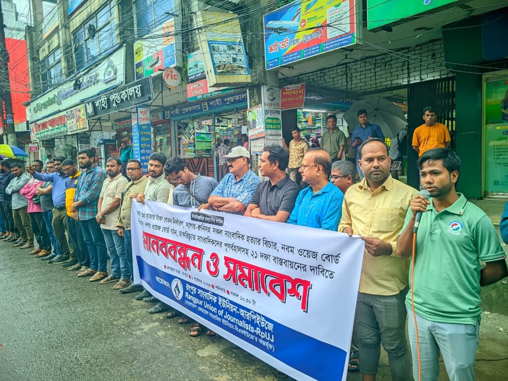 সাংবাদিকদের আর্থিক ও কর্মক্ষেত্রের নিরাপত্তাসহ মুক্ত গণমাধ্যম প্রতিষ্ঠাসহ ২১ দফা দাবি বাস্তবায়ন না হলে লং মার্চ টু যমুনার ঘোষণা দিয়েছেন রংপুরের সাংবাদিকরা।গতকাল শনিবার ( ১ নভেম্বর) দুপুরে রংপুর সাংবাদিক ইউনিয়ন আরপিইউজে আয়োজনে মানববন্ধন থেকে এই ঘোষণা দেন নেতৃবৃন্দ। মহানগরীসহ আট উপজেলার দুই শতাধিক গণমাধ্যমকর্মী বৃষ্টিতে ভিজে এতে অংশ নেন। আরপিইউজে সভাপতি সালেকুজ্জামান সালেকের সভাপতিত্বে ও সাধারণ সম্পাদক সরকার মাজহারুল মান্নানের সঞ্চালনায় মানবন্ধনে সংহতি প্রকাশ করে রংপুর প্রেসক্লাব, সিটি প্রেসক্লাব, রিপোর্টার্স ক্লাব, রিপোর্টার্স ইউনিটি, বাংলাদেশ ফটো জার্নালিষ্ট এসোসিয়েশন, টেলিভিশন ক্যামেরা জার্নালিষ্ট এসোসিয়েশন, বেগম রোকেয়া বিশ্ববিদ্যালয় সাংবাদিক সমিতি, অনলাইন জার্নালিষ্ট এসোসিয়েশন, জাতীয় সাংবাদিক সংস্থাসহ মাহিগঞ্জ, সদর, শ্যামপুর, গঙ্গাচড়া, পীরগাছা, কাউনিয়া, তারাগঞ্জ, বদরগঞ্জ, মিঠাপুকুর, পীরগঞ্জ উপজেলার বিভিন্ন প্রেসক্লাব ও সাংবাদিক সংগঠন।
