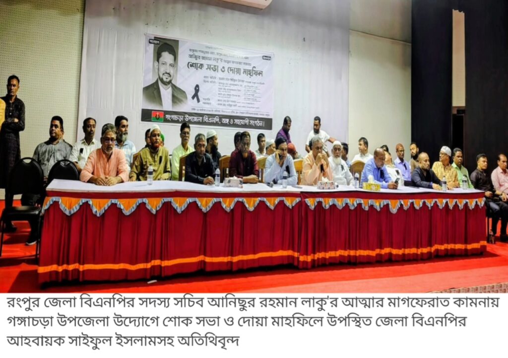 রংপুর জেলা বিএনপির সদস্য সচিব আনিছুর রহমান লাকু’র আত্মার মাগফেরাত কামনায় গঙ্গাচড়া উপজেলা উদ্যোগে শোক সভা ও দোয়া মাহফিলের আয়োজন করা হয়। রোববার মাগরিবের নামাজের পর উপজেলা মাল্টিপারপাস হলরুমে অনুষ্ঠিত শোক সভা ও দোয়া মাহফিলে প্রধান অতিথি হিসেবে উপস্থিত ছিলেন জেলা বিএনপির আহবায়ক সাইফুল ইসলাম। গঙ্গাচড়া উপজেলা বিএনপির সভাপতি চাঁদ সরকারের সভাপতিত্বে শোক সভায় বিশেষ অতিথি হিসেবে উপস্থিত ছিলেন জেলা বিএনপির সদস্য আলহাজ্ব ওয়াহেদুজ্জামান মাবু, সদস্য