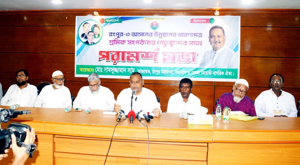 রংপুর-৩ (সদর ও সিটি কর্পোরেশন আংশিক) আসনের দীর্ঘদিনের উন্নয়ন-বঞ্চনা ঘোচাতে এবং ভবিষ্যৎ উন্নয়নের ধারাকে শ্রমিক-বান্ধব করার লক্ষ্যে এক গুরুত্বপূর্ণ পরামর্শ সভা অনুষ্ঠিত হয়েছে। সভায় রংপুর মহানগর বিএনপি ও বৈষম্যবিরোধী নাগরিক ঐক্যের আহ্বায়ক, বিএনপির দলীয় মনোনয়ন প্রত্যাশী সামসুজ্জামান সামু তাঁর ‘সমৃদ্ধ রংপুর’ রূপকল্পের খসড়া উপস্থাপন করেন এবং শ্রমিক সংগঠনগুলোর কাছ থেকে সরাসরি মতামত ও পরামর্শ গ্রহণ করেন।