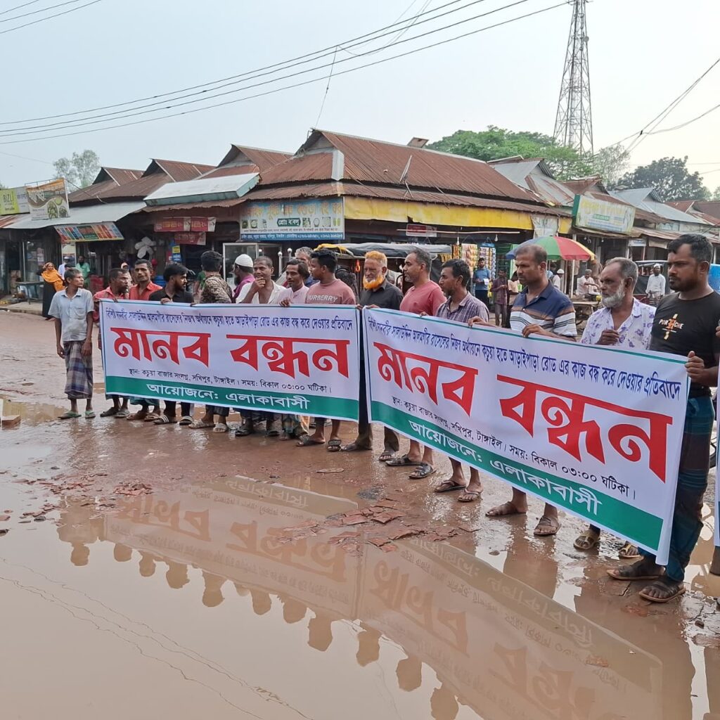 টাঙ্গাইলের সখীপুর উপজেলার কচুয়া-আড়াইপাড়া সড়কের সংস্কার কাজ বন্ধের প্রতিবাদ ও দ্রুত পুনরায় কাজ চালুর দাবিতে মানববন্ধন অনুষ্ঠিত হয়েছে।