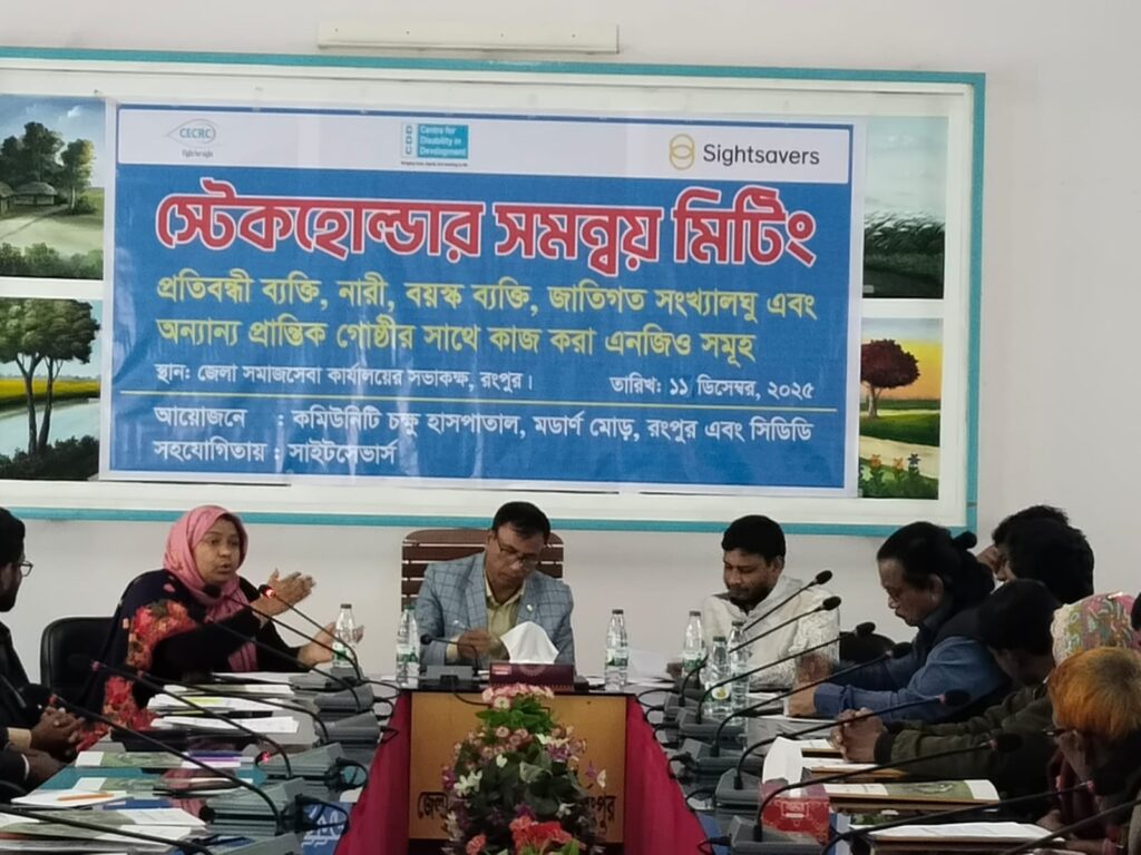 কমিউনিটি চক্ষু হাসপাতাল, মর্ডাণ মোড় এর উদ্দ্যেগে সাইটসেভার্স এর অর্থায়নে এবং সহায়তায় ডিসট্রিক্ট ইনকু¬িসভ আই কেয়ার প্রোগ্রাম প্রকল্পের অধীনে রংপুরে কর্মরত প্রতিবন্ধী ব্যক্তি, দলিত হরিজন,আদিবাসী এবং নারী সংগঠনের প্রতিনিধিদের অংশগ্রহনে বৃহস্পতিবার চক্ষুসেবা বিষয়ে সমন্বয় মিটিং রংপুর জেলা সমাজসেবা কার্যালয়ের কনফারেন্স রুমে অনুষ্ঠিত হয়।