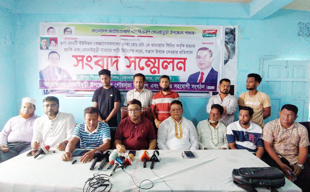 নোয়াখালীর সোনাইমুড়ী উপজেলার ৯নং দেওটি ইউনিয়ন স্বেচ্ছাসেবক দলের নেতা মোঃ রনিকে জামায়াত-শিবিরের হত্যার হুমকি ও সোনাইমুড়ী বাজারে লাঠি মিছিলের নামে সন্ত্রাস উসকে দেওয়ার প্রতিবাদে সংবাদ সম্মেলন করছে সোনাইমুড়ী উপজেলা ও পৌরসভা বিএনপি এবং অঙ্গ ও সহযোগী সংগঠন।
