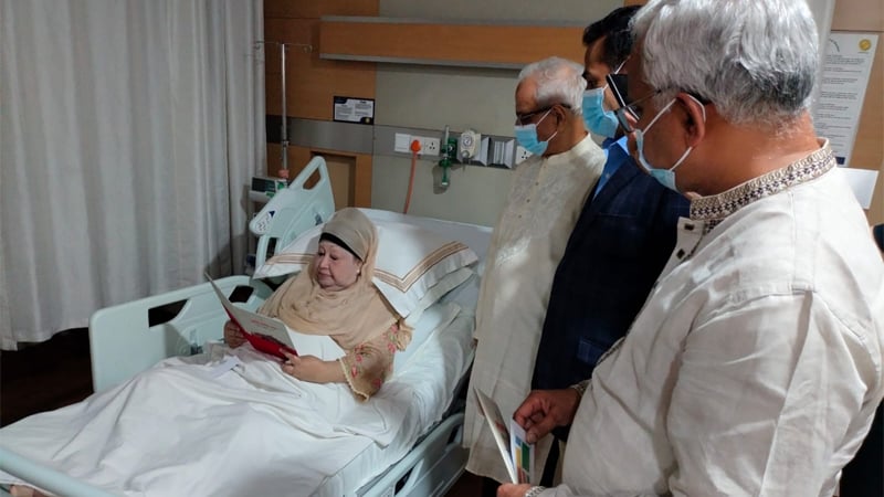 বৃহস্পতিবার (১৬ অক্টোবর) বিকেলে রাজধানীর এভারকেয়ার হাসপাতালে গিয়ে কমিশনের সদস্য ড. বদিউল আলম মজুমদার ও প্রধান উপদেষ্টার বিশেষ সহকারী সাংবাদিক মনির হায়দার খালেদা জিয়ার হাতে আমন্ত্রণপত্র তুলে দেন।