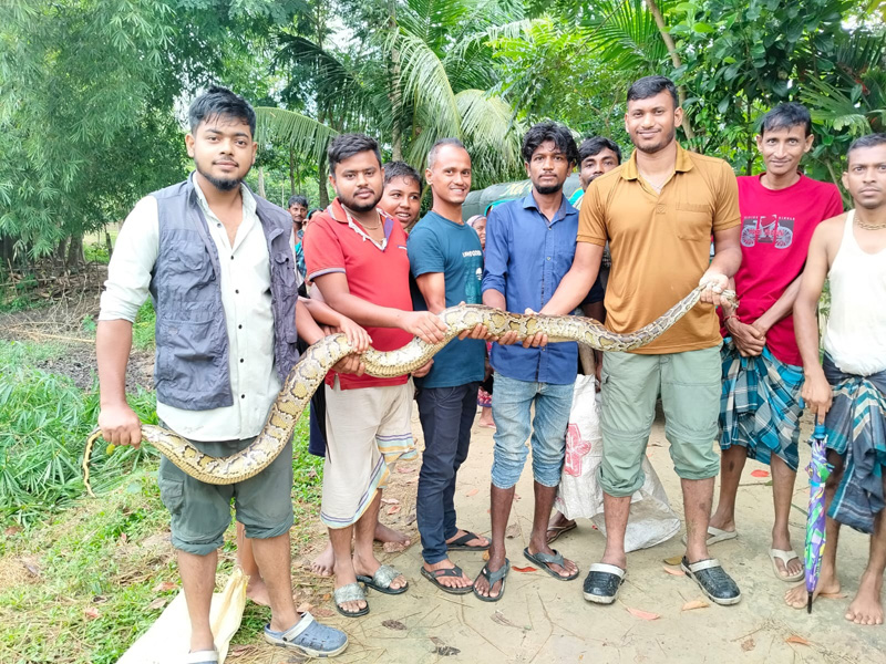 কমলগঞ্জ উপজেলার মাধবপুর ইউনিয়নের লঙ্গুরপাড় এলাকার একটি ধানক্ষেত থেকে বৃহস্পতিবার সকালে ১০ ফুট লম্বা একটি অজগর সাপ উদ্ধার করা হয়েছে। সাপটি উদ্ধার করেন সাপ সংরক্ষক ও ক্রিয়েটিভ কনজারভেশন অ্যালায়েন্সের সংরক্ষণকর্মী চঞ্চল গোয়ালা। পরে বন বিভাগের সহায়তায় সেটিকে লাউয়াছড়া জাতীয় উদ্যানে অবমুক্ত করা হয়। চঞ্চল গোয়ালা জানান, সকাল সাড়ে ছয়টার দিকে স্থানীয়রা ধানখেতে অজগর আটকা পড়ার খবর দিলে তিনি দ্রুত ঘটনাস্থলে পৌঁছান। ধানক্ষেতে থাকা নেটের বেড়ায় পেঁচিয়ে সাপটি আটকা পড়েছিল। পরে নেট কেটে অজগরটিকে উদ্ধার করে লাউয়াছড়া জাতীয় উদ্যানের রেসকিউ সেন্টারে নিয়ে যাওয়া হয়। কিছুটা আঘাতপ্রাপ্ত থাকলেও চিকিৎসার পর দুপুর ১টার দিকে অজগরটিকে বনে অবমুক্ত করা হয়। লাউয়াছড়া জাতীয় উদ্যানের রেঞ্জ কর্মকর্তা কাজী নাজমুল হক বলেন, বনরক্ষীদের সহায়তায় অজগরটি নিরাপদে অবমুক্ত করা হয়েছে। পাশাপাশি বনসংলগ্ন এলাকার বাসিন্দাদের সাপ দেখলে পিটিয়ে না মারার অনুরোধ জানান তিনি।