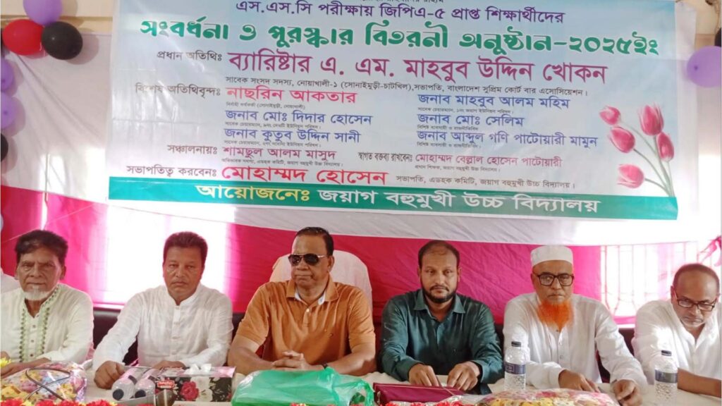 শনিবার (৬ সেপ্টেম্বর) দুপুরে নোয়াখালীর সোনাইমুড়ী জয়াগ বহুমুখী উচ্চ বিদ্যালয় মিলনায়তনে ২০২৫ সালের পরীক্ষায় জিপিএ-৫ প্রাপ্ত শিক্ষার্থীদের সংবর্ধনা ও পুরস্কার বিতরণী অনুষ্ঠানে প্রধান অতিথির বক্তব্যে এসব কথা বলেন বিএনপি চেয়ারপার্সন এর উপদেষ্টা, সুপ্রিম কোর্ট বার এসোসিয়েশনের সভাপতি ও নোয়াখালী-১ আসনের সংসদ সদস্য ব্যারিস্টার এ এম মাহবুব উদ্দিন খোকন।