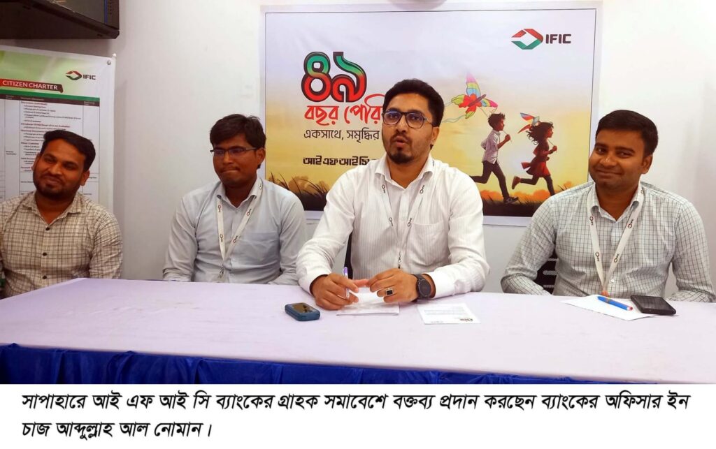 আই এফ আই সি ব্যাংকের সাপাহার উপশাখার অফিসার ইনচার্জ আব্দুল্লাহ আল নোমান এর সভাপতিত্বে বুধবার বিকেল ৫টায় ব্যাংক প্রাঙ্গনে অনুষ্টিত সমাবেশে ব্যাংকের অন্যতম গ্রাহক ধান্যব্যাবসায়ী আব্দুল মান্নান, বিশিষ্ট ব্যাবসায়ী অধ্যক্ষ আলহাজ¦ সোলাইমান আলী, সাপাহার পাইলট হাই স্কুলের শিক্ষক চপল চৌধুরী, প্রমুখ বক্তব্য প্রদান করেন।