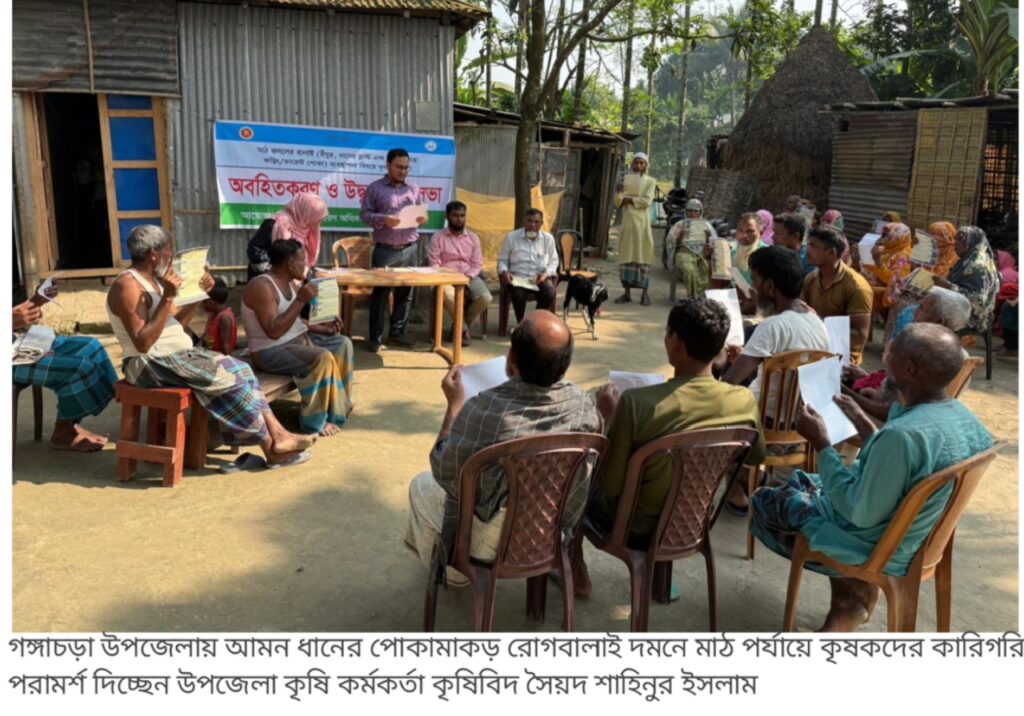 রংপুরের গঙ্গাচড়া উপজেলা কৃষি অফিসের কারিগরি পরামর্শে কৃষকে চাষাবাদকৃত আমন ধানের পোকামাকড়, রোগবালাই দমনে ব্যতিক্রমী উদ্যোগের কারণে বাম্পার ফলনে আশাবাদী কৃষকগণ। মাঠ পর্যায়ে কৃষি অফিসের এমন উদ্যোগে কৃষকগণ যেমন উপকৃত হচ্ছেন তেমনি আগামীতে ধান চাষাবাদে তাদের এ অভিজ্ঞতাকে কাজে লাগিয়ে নিজেরা ভাল ফসল ঘরে তুলতে পারবেন বলে জানান কৃষকগণ। উপজেলায় এ বছর আমনের সর্বোচ্চ ১৯ হাজার ৩ শত ৫৫ হেক্টর জমিতে আবাদ অর্জিত হয়েছে। এজন্য কৃষি সম্প্রসারণ অধিদপ্তর গঙ্গাচড়া বীজতলা থেকে শুরু করে ধানের পরিপক্কতা পর্যায় পর্যন্ত সার্বক্ষণিক মাঠে কারিগরি পরামর্শ প্রদান অব্যাহত রেখেছে। সম্প্রতি মাঠ পর্যায়ে কারেন্ট পোকার আক্রমণ দেখা দিলে, এ পরিস্থিতি মোকাবেলা করার জন্য কৃষককে আতঙ্কিত না হয়ে দ্রুত কার্যকরী পদক্ষেপ নেয়ার আহবান জানিয়েছেন গঙ্গাচড়া কৃষি সম্প্রসারণ অধিদপ্তর। উপজেলা কৃষি কর্মকর্তা সৈয়দ শাহিনুর ইসলাম জানান, যে কারেন্ট পোকা এর আক্রমণে ধানের গোড়ায় পোকা জমে রস চুষে নেয় ফলে গাছ গাছ শুকিয়ে হপার বার্ন আকারে ফসলের ক্ষতি করে। এ পোকা সাধারণত অতিরিক্ত ইউরিয়া সার প্রয়োগ, মাটিতে পানি জমে থাকা, স্যাঁতস্যাঁতে আবহাওয়া, গুমোট পরিবেশে বেশি বংশবিস্তার করে থাকে। ফসলের জমিতে রোগ ও পোকার প্রাকৃতিক দুর্যোগ এটি মোকাবেলা করার জন্য উপজেলা কৃষি অফিস মাঠ পর্যায়ে কৃষকদের নিয়ে উঠান বৈঠকের মাধ্যমে পরামর্শ দিয়ে আসছে। উঠান বৈঠকে কৃষকদের গুরুত্ব সহকারে যে সকল পরামর্শ দেওয়া হচ্ছে, তার মধ্যে হলো জমিতে অতিরিক্ত পানি জমে না থাকা, সুষম মাত্রায় সার প্রয়োগ, বিশেষ করে ইউরিয়া সারের পরিমিত ব্যবহার করা, আক্রান্ত জমির চারপাশের আগাছা ও পাতা পরিষ্কার রাখা, এলএলপি প্রযুক্তি গ্রহণে কৃষকদের উৎসাহিত করা, কৃষককে জমিতে যেয়ে প্রতি দুই হাত দূরে কেটে দেওয়ার পরামর্শ প্রদান, কারেন্ট পোকা প্রতিরোধী জাত ও মানসম্মত বীজ ব্যবহার করা, ফসল কাটার পর নাড়া পুড়িয়ে দেওয়া ও সঠিক সময়ে সঠিক মাত্রায় নির্ধারিত কীটনাশক ব্যবহার করা। উপজেলা কৃষি কর্মকর্তা আরো জানান যে, কারেন্ট পোকা দমন সম্ভব যদি কৃষক সময়মত পর্যবেক্ষণ করে এবং সঠিক ব্যবস্থাপনা গ্রহণ করে। এছাড়াও আমরা নিয়মিত কৃষকের মাঠ পরিদর্শন করছি, লিফলেট বিতরণ, উঠান বৈঠক, আলোচনা সভা মতবিনিময় সহ সন্ধ্যাবেলা আলোকফাঁদ কার্যক্রম, অতন্দ্র জরিপ কার্যক্রম চলমান রেখেছি। আমাদের ব্লক পর্যায়ে থেকে শুরু করে উপজেলা পর্যায়ের সকল কর্মকর্তা নিরলসভাবে কার্যক্রম চালিয়ে যাচ্ছেন। উপজেলার দক্ষিণ কোলকোন্দ গ্রামের কৃষক মিজানুর, সিপন জানান, তারা কৃষি অফিসারের পরামর্শ মোতাবেক আবাদকৃত আমন ধানের যত্ন নেওয়ায় তাদের ধানে পোকামাকড় আক্রমণ করে নাই 