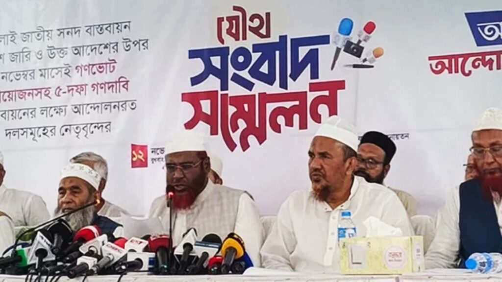 জুলাই জাতীয় সনদ বাস্তবায়ন আদেশ জারি ও ওই আদেশের ওপর গণভোট আয়োজনসহ পাঁচ দফা দাবিতে প্রধান উপদেষ্টার কার্যালয় যমুনার সামনে অনির্দিষ্টকালের জন্য অবস্থান কর্মসূচির হুঁশিয়ারি দিয়েছে জামায়াতে ইসলামীসহ আন্দোলনরত আট দল।