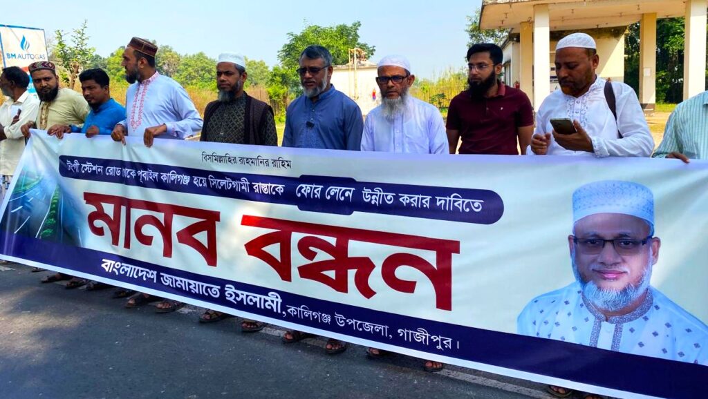 টঙ্গি-ঘোড়াশাল ভায়া কালীগঞ্জ সড়কটি চারলেনে উন্নীত করার দাবীতে গাজীপুরের কালীগঞ্জে উপজেলা জামায়াত ইসলামীর উদ্যোগে মানব বন্ধন কর্মসূচী পালন করা হয়েছে। সড়কটি দিয়ে প্রতিদিন ঢাকা হতে নরসিংদী, ব্রাক্ষনবাড়িয়া, কুমিল্লা, সিলেট, চট্রগ্রাম ও উত্তরবঙ্গের বহু পরিবহন যাতায়াত করে থাকে। সড়কটি দুইলেন বিশিষ্ট হওয়ায় কয়েক কি.মি. পর্যন্ত দীর্ঘ যানজট লেগে থাকে ঘন্টার পর ঘন্টা। এত করে ভোগান্তি পোহাতে হয় সাধারণ যাত্রীদের।